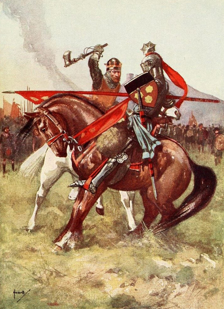 Gilbert de Clare and Humphrey de Bohun and their men crossed over the Bannockburn and marched towards the woodland where the Scots were waiting. They were unaware that Robert the Bruce had wandered away from his men and was not armed for combat, but for reconnaissance, with a small horse, light armor, and a battle axe.